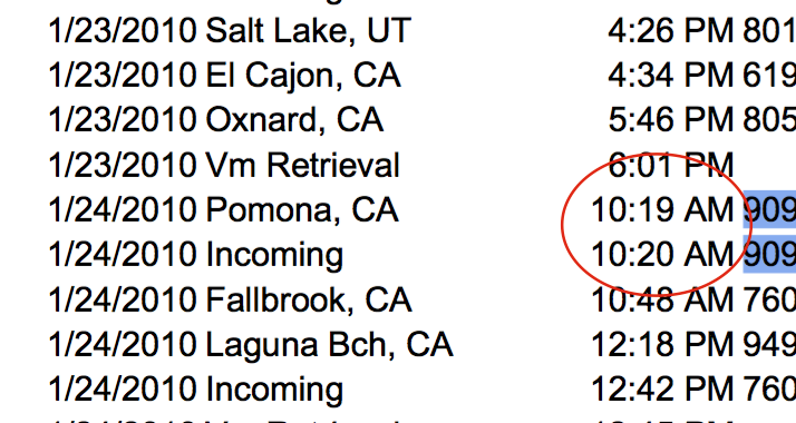 Carmen recalls phoning Joseph Friday, February 5 and being unable to reach him. There is a call from Carmen to Joseph the Friday before on January 29th. But as phone records prove, Chase Merritt was at home all the following Monday (so a Feb 1 encounter at Metro could not be mistaken for Feb 8). He does not ping in Azusa (where Metro Sheet Metal was located) at all on Feb 1, so it is unlikely that Carmen is confusing the Mondays. And though the DA at trial suggested that Carmen confused Monday the 8th with Tuesday the 9th, this theory is also not supported by phone records.